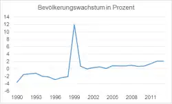 Im Jahr 2005 lebten in Leipzig wieder über 500.000 Menschen. Das ist ein Anstieg von 63.000 Einwohnern gegenüber 1998. Zum Teil ist dieser Zuwachs auf Eingemeindungen umliegender Kommunen in den Jahren 1999 und 2000 zurückzuführen. Die Ortsteile Burghausen und Rückmarsdorf gehörten zu den letzten Eingemeindungen der Stadt Leipzig.[3] Bereinigt um Eingemeindungen verlor Leipzig in den Jahren 1990 bis 2012 rund 4,6 % seiner Einwohner, gewann jedoch mit Eingemeindungen 4,0 % hinzu, bei einer Verdoppelung der Stadtfläche.[4] Seit einigen Jahren profitiert die Kernstadt jedoch auch von deutlichen Wanderungsgewinnen. Am 31. Dezember 2011 betrug die „Amtliche Einwohnerzahl“ für Leipzig nach Fortschreibung des Statistischen Landesamtes des Freistaates Sachsen 510.043[5] (nur Hauptwohnsitze und nach Abgleich mit den anderen Landesämtern). Während Leipzig auf der Liste der größten deutschen Städte 1946 mit knapp 608.000 Einwohnern noch den vierten Platz hinter München belegte, fiel die Stadt im Jahr 2010 auf Platz dreizehn zurück. Ende 2019 lag sie auf Platz 8.[6]