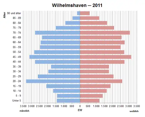 Am 31. Mai 2013 veröffentlichte der Landesbetrieb für Statistik und Kommunikationstechnologie Niedersachsen das Ergebnis der VolkszählungZensus 2011 für Niedersachsen.[1] Danach hatte Wilhelmshaven zum Stichtag 31. Dezember 2011 76.926 Einwohner. Das ist ein Minus von 5,1 % gegenüber der bisherigen offiziellen Einwohnerzahl 81.020 zum Stichtag 31. Dezember 2011, die auf einer Fortschreibung der Volkszählung von 1987 basiert. Wilhelmshaven war damit nach Osnabrück (−6,4 %) die am stärksten von der Neuberechnung betroffene Stadt in Niedersachsen.[2]