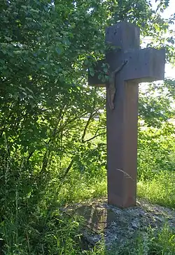 Noch 1954 errichtete der Heimatverein 1953 Abenheim e. V. ein Holzkreuz an der Unfallstelle, das 1960 durch ein steinernes Kreuz mit Kruzifix ersetzt wurde und das 1986 nochmals durch ein größeres ersetzt wurde.[4][1] Als der ursprüngliche Standort dem Bau der Überführung der Kreisstraße über den Autobahnzubringer im Weg stand, wurde es an seinen heutigen Standort in der Nähe des Unfallortes versetzt. Das Denkmal wurde – wohl im Hinblick auf den 65. Jahrestag des Unfalls – im Sommer 2019 von üppigem Bewuchs freigeschnitten. Die heute nur noch schwer lesbare Inschrift lautet: