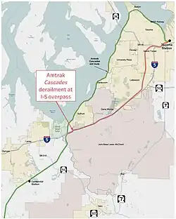Die Unfallstelle liegt etwa 5 Kilometer südwestlich von DuPont, 30 Kilometer südwestlich von Tacoma im Pierce County und etwa 70 Kilometer südlich von Seattle.[1] Hier überquert die Bahnstrecke die Autobahn Interstate 5 (I-5), die entlang der Westküste der USA zwischen der mexikanischen und der kanadischen Grenze verläuft.