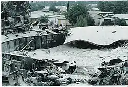 Der Beimann und der Bremser, die in den Lokomotiven an der Spitze des Zuges saßen, und zwei Kinder in einem der zerstörten Häuser starben.[10] Sieben Häuser in der Duffy Street, die unmittelbar neben den Gleisen gestanden hatten, wurden zerstört, ebenso die führenden vier Lokomotiven und alle Güterwagen.[11] Der Lokführer auf der führenden Lok überstand den Unfall auf seinem Sitz im Führerstand. Er brach sich mehrere Rippen, von denen auch welche in die Lunge eindrangen, konnte sich aber aus der zerstörten Lokomotive selbst befreien und wurde von Augenzeugen geborgen. Die beiden Männer auf der hinteren Lokomotiv-Einheit erlitten leichte Verletzungen.
