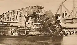 Inzwischen hatte der Bediener der Drehbrücke diese geöffnet, um Schiffe passieren zu lassen. Dies wurde beim Zurücksetzen des Zuges nicht bemerkt. Da der Zug recht lang war, stürzte der letzte Personenwagen des rückwärtsfahrenden Zuges von der Brücke und blieb senkrecht an der Kupplung hängen. Als die Luftleitung riss, legten die Bremsen an und der Zug kam zum Stehen. Die Kupplung des Wagens war jedoch so stark, dass sie nicht abriss und der Wagen senkrecht hängen blieb.