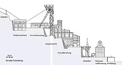 - Friedrich Wilhelm Aufbereitung (im Vordergrund) und Schacht Grube Einigkeit (später Friedrich Wilhelm) im Hintergrund, Blick von Norden nach Süden, 1913.