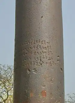 Die Säule mit dem Chakra-Idol auf seiner Spitze war ursprünglich an einem Ort aufgestellt, der Vishnupadagiri („Hügel mit dem Fußabdruck Vishnus“) genannt wurde.[2] Dieser Ort wurde mit den Höhlentempeln von Udayagiri in der Nähe von Sanchi und Vidisha gleichgesetzt. Eine (nachträglich?) auf der Säule angebrachte Inschrift besagt, dass sie zu Ehren des Hindu-Gottes Vishnu errichtet wurde. Ferner werden der Heldenmut und die Güte eines als Chandra bezeichneten Königs gepriesen, der von der jüngeren archäologischen Forschung mit Chandragupta II. identifiziert wird.