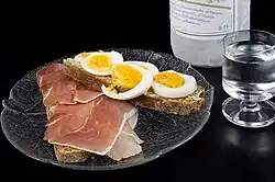 „Eisgekühlter Bommerlunder, Bommerlunder eisgekühlt; eisgekühlter Bommerlunder, Bommerlunder eisgekühlt und dazu ein belegtes Brot mit Schinken, ein belegtes Brot mit Ei. Das sind zwei belegte Brote, eins mit Schinken und eins mit Ei.“