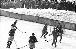 In den 1930er-Jahren erfährt der Eishockeysport im Harz – wie auch in anderen Regionen in Deutschland – einen deutlichen Auftrieb. Braunlage und Schierke zählten neben Oberhof (Thüringer Wald), Feldberg (Schwarzwald), Schreiberhau und Krummhübel (Riesengebirge) sowie den oberbayerischen Gemeinden Garmisch und Partenkirchen in jenen Jahren zu den bedeutendsten deutschen Wintersportorten.[24][25] Ein für den Wintersport und insbesondere für das Eishockey im Harz bedeutender Schritt waren die gemeinsamen Aktivitäten der Wintersportorte Braunlage und Schierke zu Beginn der 1930er-Jahre. Beim Deutschen Skiverband bewarben sich beide Orte gemeinsam um die Durchführung einer deutschen Meisterschaft und im November 1932 beim Olympiaausschuss in Berlin um die Austragung der Olympischen Winterspiele 1936.[26] Am 7. und 8. Januar 1933 besichtigte die Prüfungskommission Braunlage und Schierke, bevor sie die anderen Bewerberstädte besuchte.[27] Letztlich wurden die Olympischen Winterspiele nach Garmisch-Partenkirchen vergeben, aber die Ausrichtung der Deutschen Winterkampfspiele vom 26. Januar bis zum 4. Februar 1934 wurde Braunlage und Schierke zugesprochen. Braunlage war Austragungsort für die Sprungläufe, Eisschnelllauf über 500 und 10.000 Meter, Eiskunstlauf und Eisstockschießen, während in Schierke Damen-Slalom, Rennrodeln, Bobrennen mit Zweier- und Viererbobs sowie der Eishockeywettbewerb ausgetragen wurden.[A 3]