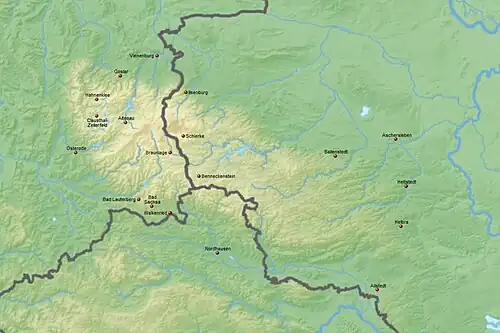 Da der Harz weder kulturräumlich, noch administrativ eine eindeutige Abgrenzung hat, wird die Betrachtung des Eishockeysports im Harz in etwa auf den Bereich bezogen, der durch die vom Harzer Tourismusverband präsentierten Urlaubsorte abgegrenzt wird.[1] Der Betrachtungsraum umfasst somit ein Gebiet, welches von einer gedachten Linie zwischen den Orten Hornburg, Lamspringe, Kalefeld, Duderstadt, Kelbra, Lutherstadt Eisleben, Aschersleben, Seeland, Halberstadt und schließlich wieder Hornburg eingekreist wird. Es erstreckt sich auf Teile der niedersächsischen Landkreise Goslar und Göttingen, den thüringischen Landkreis Nordhausen sowie die sachsen-anhaltischen Landkreise Mansfeld-Südharz, Salzlandkreis und Harz.