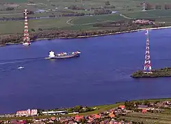 Vorn Elbekreuzung 2, dahinter Elbekreuzung 1, links: Insel Lühesand mit den südlichen Tragmasten beider Elbekreuzungen, im Hintergrund am Elbufer das ehemalige KKW Stade. -