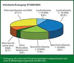 Die Stromerzeugung in Österreich betrug im Jahr 2009 69,0 Mrd. kWh.[4] Davon stammen 69,7 % aus erneuerbaren Energiequellen.