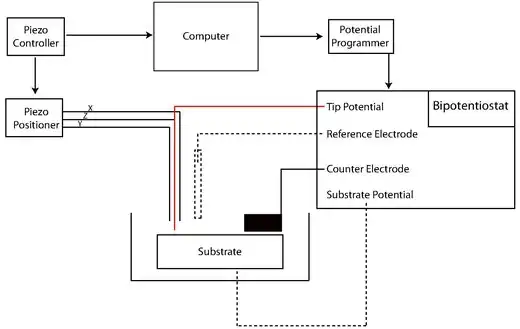 Der Potentiostat misst die Spannung des drei-Elektrodensystems für voltammetrische Experimente. Die UME ist die Arbeitselektrode, um eine kontrollierte Spannung am Substrat anzulegen. Die Hilfselektrode (oder Zählelektrode) reguliert den Strom, der an der Arbeitselektrode entsteht, oft durch eine Redoxredaktion mit dem Lösungsmittel oder einem Elektrolytzusatz. Die Spannung wird relativ zu einem genau definierten Reduktionspotential der Referenzelektrode gemessen, durch die selbst kein Strom fließt.