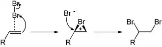 Molekulare Halogene können in einem zweistufigen Mechanismus an die Doppelbindung von Alkenen addiert werden. Das Halogenmolekül tritt hierbei in Wechselwirkung mit der Doppelbindung des Alkens, wodurch das Halogenmolekül polarisiert wird und sich die Elektronenbindung heterolytisch spaltet. Im ersten Schritt erfolgt die Addition eines Haloniumions (hier als Beispiel: eines Bromoniumions (Br+)) an die Doppelbindung des Kohlenstoffatoms, bei der es unter Aufspaltung der Doppelbindung ein kurzlebiges cyclisches Kation bildet. Im zweiten Schritt greift das Halogenidion (hier: Bromidion) nukleophil am positivierten Kohlenstoffatom an, wodurch das gesättigte α,β-dihalogenierte Produkt erhalten wird.