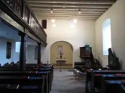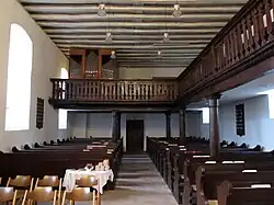 Von der Inneneinrichtung des Neubaus aus dem 18. Jahrhundert erhielt sich nur eine Bank mit geschnitzter Randrille im Seitenteil.[3] Im Zuge der Restaurierungsmaßnahmen von 1826 kamen eine neue Kanzel, eine Empore im klassizistischen Stil, ein hölzerner Altar, ein Pfarrstuhl sowie neue Bänke hinzu, die nach dem Muster der Bank aus dem 18. Jahrhundert angefertigt wurden.[5]