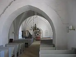 Der Kirchsaal fasst etwa 250 Gottesdienstbesucher. Der Altar aus dem Jahr 1635 zeigt ein Bild des gekreuzigten Christus, über dem Altarbild befindet sich ein Baldachin. Die Kanzel stammt aus dem Jahr 1766 und ist in denselben Farben gehalten wie der Altar.
