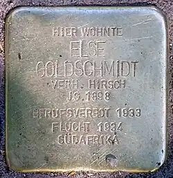Am 16. Juni 2022 wurde ein Stolperstein für Else Goldschmidt, ihre Mutter Ella Goldschmidt und ihre Schwester Gerda Goldschmidt in der Dernburgstraße 4 (ehemals Dernburgplatz 1) in Berlin-Charlottenburg verlegt. Unterstützt von der Stolperstein-Initiative Berlin Charlottenburg-Wilmersdorf e.V. und initiiert von Katrin Richter fand das Gedenken im Beisein der Nachfahren und einer interessierten Öffentlichkeit statt.