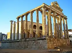 Der sogenannte Tempel der Diana war Teil des Forums der Stadt. Er diente dem Kaiserkult, in dem die Imperatoren als Götter verehrt wurden. Der Name „Dianatempel“ wurde bei der Entdeckung irrtümlich vergeben. Es ist das einzige religiöse Gebäude der Stadt, das sich in einem zufriedenstellenden Zustand erhalten hat. Es wurde gegen Ende des ersten vorchristlichen oder Anfang des ersten christlichen Jahrhunderts in der augusteischen Epoche erbaut. Das Gebäude ist rechteckig und war von Säulen umgeben. Die Vorderfront zeigte zum Forum und besteht aus sechs Säulen. Der gute Erhaltungszustand ist dem Umstand zu verdanken, dass das Gebäude in den Palast der Grafen de los Corbos integriert wurde, welcher im Renaissancestil errichtet wurde und dessen Reste immer noch zu sehen sind. Zu seinem Bau wurden vor allem Granitsteine und -säulen verwendet.