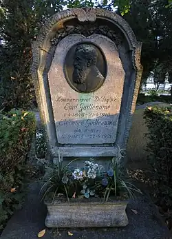 Emil Guilleaume starb 1913 im Alter von 67 Jahren. Die Grabstätte der Eheleute befindet sich auf dem Kölner Melaten-Friedhof (Flur 5 in P). Das Portraitrelief auf der Grabstele wurde von Wilhelm Albermann gefertigt.[1]