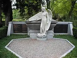 Grabmal der Industriellenfamilie Knorr mit dem Standbild eines trauernden, weiblichen Engels mit ausgebreiteten Schwingen und nach unten gerichteter Fackel. | |