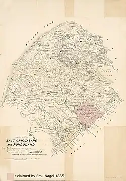 Am 20. Juni 1885 schloss Nagel mit den Oberhäuptern des Pondolandes, den Brüdern Umhlangaso und Umquikela, Vereinbarungen über eine Landkonzession für eine Land- und Kolonisationsgesellschaft.[7] Das Konzessionsgebiet hatte eine Fläche von etwa 160 englischen Quadratmeilen oder 41.125 Hektar.[8] Es lag östlich des Flusses Mzimvubu und beinhaltete ein Waldgebiet, den Egosa- oder Ekossi-Busch.[9][10] Der Küstenabschnitt reichte bis zur nördlichen Wild Coast am Indischen Ozean zwischen dem 31. und 32. südlichen Breitengrad.[11] Im Gegenzug sagte Nagel den Bewohnern Pondolands Schutz vor den Briten zu. Außerdem sollten zwei Söhne der Königsfamilie durch die Hermannsburger Mission in Deutschland erzogen werden. Nagel brachte die beiden Pondojungen via Durban nach Deutschland und behandelte sie fortan wie ein Faustpfand gegenüber den Pondoherrschern. Einer der Königssöhne, der siebzehnjährige Oskar Umhlangaso erkrankte jedoch schon bald nach seiner Ankunft in Deutschland so schwer, dass er mithilfe der Missionare wieder abreiste und noch auf der Rückfahrt nach Afrika verstarb. Durch diesen tragischen Vorfall und aufgrund unhaltbarer Versprechungen wurde Nagel im Pondoland zur Persona non grata.[12] In den folgenden Monaten warb Nagel in Berlin erfolglos um Anerkennung der Vereinbarungen zur Errichtung einer deutschen Kolonie. Obwohl die deutsche Regierung nie ernsthaft in Erwägung zog, das Pondoland zu annektieren, wurde Nagels Initiative durch das Empire wachsam verfolgt und die Korrespondenz zur Pondoland-Affäre dokumentiert.[4] Schließlich wurde das Pondoland im Jahr 1887 ein Protektorat Großbritanniens.[13] An der späteren Übertragung der Konzessionsrechte und -pflichten auf die Deutsche Pondoland-Gesellschaft war Nagel nicht mehr persönlich beteiligt.[14]