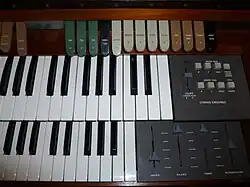 ⦁ Oberes und unteres Manual: Sustain-Gruppe (Vibraharp 8', Glock 8', Organharp 8', Celesta 8', Streicher 8')