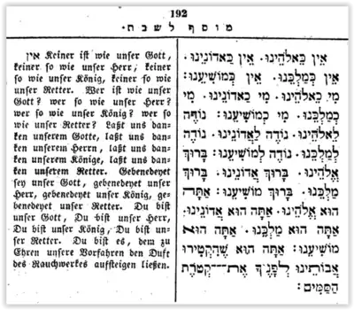 „Nichts ist wie unser Gott, nichts wie unser Herr, nichts wie unser König, nichts wie unser Helfer. Wer ist wie unser Gott, wer wie unser Herr, wer wie unser König, wer wie unser Helfer! Wir huldigen dankend unserem Gotte, dankend unserm Herrn, dankend unserm König, dankend unserm Helfer. Du, Du bist unser Gott, Du unser Herr, Du unser König, Du unser Helfer. Du bists, vor dessen Angesicht unsere Väter das Spezereiräucherwerk aufdampfen ließen.“ |