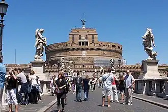 Der antike Name der Brücke (Pons Aelius) ist zwar im gelehrten (vor allem lateinischen) Schrifttum nie ganz außer Gebrauch gekommen, volkstümlich ist aber schon seit dem Mittelalter die Benennung als Engelsbrücke, weil sie direkt auf die Engelsburg zuführt.[1]