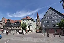 - Waagstraße 5 – Mehrteilige Baugruppe: dreigeschossiges Wohnhaus, teils verputzt, teils Fachwerk verschiefert, 18. Jh., Mansarddach von 1890; nördlich im rechten Winkel anschließend zweigeschossiger Neurenaissance-Eckbau, 1889 von Johann Michael Horneber; davor freistehend parallel zum älteren Flügel Sandstein-Vorbau mit Portal und Laden, 1889.