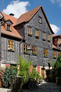 - Waagstraße 4 – Dreigeschossiges Wohnhaus in Ecklage, Obergeschoss und Nordgiebel Fachwerk verschiefert, 1. Hälfte 18. Jh.