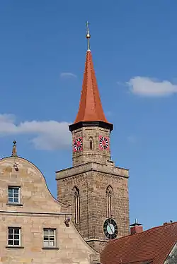 - Waagstraße 1 – Ehem. Gasthof Rotes Roß, zweigeschossiger Quaderbau mit Volutengiebel, traufseitig Fachwerkobergeschoss mit Aufzugsgaube, 1664, Giebelreiter von 1862.