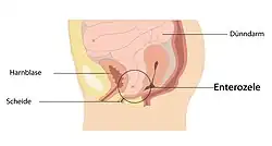 Die Enterozele ist eine Erkrankung der Frau, bei der Abschnitte des Dünndarms samt Bauchfell (Peritoneum) in den Raum zwischen Scheide (Vagina) und Mastdarm (Rektum) abgesunken sind. Sie ist Teil des Krankheitskomplexes des Genitalprolaps.[1]
