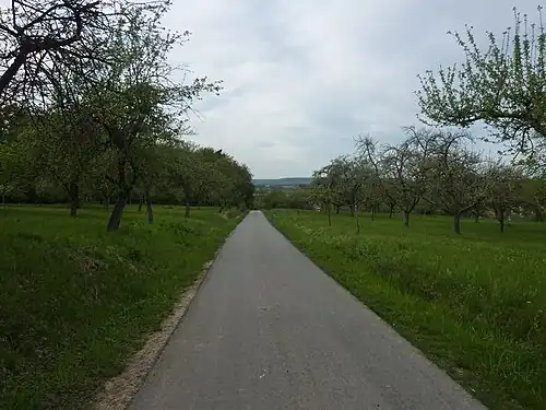 ![]() Streuobstwiesen südlich von Unterriexingen, links ist der Muckenschupf zu erkennen. | ||