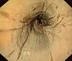 Die Behandlung von Komplikationen der eosinophilen Ösophagitis ist das Gebiet der endoskopischen Therapie. Aufgrund der dauerhaften Entzündung kommt es zu Strikturen und Stenosen, die entweder mittels Bougies oder mittels Ballon-Dilatation aufgedehnt werden können.[29] Die endoskopische Therapie ersetzt jedoch nicht die dauerhafte Fortführung der Behandlung der zugrundeliegenden Entzündung mittels Medikamenten oder Diät.