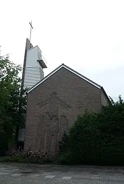 Die Kirche mit einem Satteldach und verbindendem offenen Dachstuhl über dem sechseckigen Kirchen- und dem Gemeindesaal sowie dem westlichen Chor ist verklinkert. Der seitliche Turm besteht aus Klinkersteinen und Beton. Der Bau wurde bis 1960 nach Plänen von Peter Ahlers (Bremen)[2] erstellt. Es war nach 1945 in Bremen einer der ersten neuen Kirchbauten.