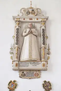 Das farbig gefasste Renaissance-Epitaph für Elisabeth Moser, geb. Luz, aus Ehingen am Ries ist 2,80 m hoch und 1,60 m breit. Das Holzepitaph mit lebensgroßer Darstellung der Verstorbenen ist nahezu vollplastisch. Auf den seitlichen Säulen sind je sechs Familienwappen angebracht. Die Basis, auf der zwei Psalmen stehen, ist außen mit Diamantsteinen besetzt. Im Auszug und unteren Anschwung sind Allianzwappen zu sehen.