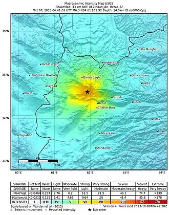 - ↑ a b c d M 6.3 - 33 km NNE of Zindah Jān, Afghanistan. USGS, abgerufen am 28. Oktober 2023 (englisch).