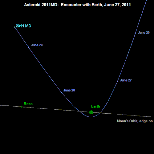 - Am 27. Juni 2011 näherte sich 2011 MD der Erde mit einem Abstand von rund 12.000 km. Der Asteroid hat einen Durchmesser von etwa 10 m, wurde fünf Tage zuvor durch LINEAR entdeckt und konnte nach dem Vorbeiflug noch sechs Tage lang beobachtet werden.