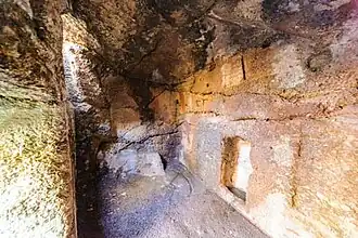 In der südlichen Felswand dieses offenen Gevierts befindet sich der ca. 1,80 m hohe Eingang in die dahinter liegende Felsenkapelle. In dieser Wand kann man oberhalb des Kapellenzugangs noch deutliche Querrillen sehen, in die einst das Dach des Vorraumes eingefügt war. Oberhalb dieses Dachniveaus ist links vom Eingang eine Fensteröffnung in den Innenraum hinein, der dadurch auch Licht erhielt als der Vorraum überdacht war.