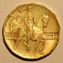 Ein 20-Kronen-Stück aus Tschechien mit Katzenglanz nach der Behandlung in einem Messing-Tauchbad