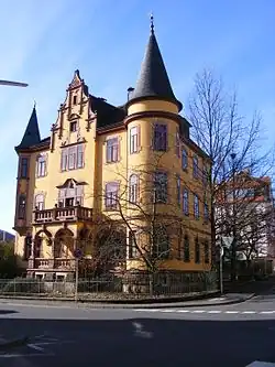 Die dreigeschossige Mietvilla entstand im Jahr 1902 unter Architekt Kiesel als Walmdachbau. Das Anwesen ist im Sinne des Historismus gestaltet, der sich im schlossartigen Aussehen des Anwesens äußert. Die hier im Sinne des Historismus angewandten Einzelelemente folgen einer stark vereinfachten deutschen Neorenaissance und äußern sich in dem Anwesen durch die Anwendung des Mittelrisalits mit Ziergiebel und Rotsandsteingliederung, des Söllers, des Eckturms mit Kegeldach sowie des Eckerkers.