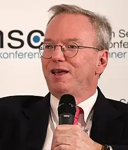 Eric Emerson Schmidt (* 27. April 1955 in Washington, D.C.[1]) ist ein US-amerikanischer Informatiker und Manager. Er war von 2001 bis 2011 Chief Executive Officer und von April 2011 bis zum 10. August 2015[2] Executive Chairman von Google. Im Zuge der Restrukturierung von Google wurde Schmidt anschließend Executive Chairman der Alphabet Inc. bis er diese 2020 verließ.[3] Zuvor arbeitete er von 1983 bis 1997 unter anderem als CTO bei Sun Microsystems, war von 1997 bis 2001 CEO bei Novell und von 2006 bis 2009 Mitglied des Board of Directors bei Apple.