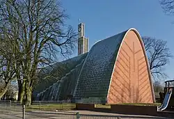 Das Gebäude verbindet moderne und traditionelle Formen und Materialien und gehört durch seine eigenwillige Gestaltung zu den beachtenswertesten Kirchenbauten der Nachkriegszeit in Hamburg. Der Bau erstreckte sich unter der Leitung von Kurt Schwarze von 1957 bis 1960. Das Kirchenschiff besteht aus zwei mit Aluminium verkleideten ineinander geschobenen Stahlbetonschalen mit parabelförmigem Querschnitt, die sich zu Fensterschlitzen auffalten. Die Fassaden der Ost- und Westseite sind mit aufwendigen, differenziert gemusterten Backsteinverkleidungen verziert. Außenbau und Innenraum stimmen konsequent überein. Die schlanke, 37 m hohe und von einem 4 m hohen Kreuz gekrönte Turmstele aus Betonscheiben ist ebenfalls zeittypisch durch einen niedrigen Verbindungsbau an das Kirchenschiff angebunden.