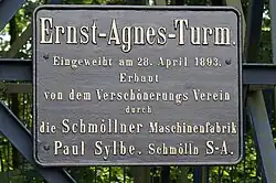Der Aussichtsturm wurde von der Schmöllner Maschinenfabrik Paul Sylbe im Auftrag des Schmöllner Verschönerungsvereins für 6.000 Goldmark nach dem Vorbild des Pariser Eiffelturms erbaut. Er wurde am 28. April 1893, anlässlich des vierzigsten Hochzeitstages des Sachsen-Altenburger Herzogspaares Ernst I. und Agnes von Anhalt-Dessau, eingeweiht und der Öffentlichkeit übergeben.