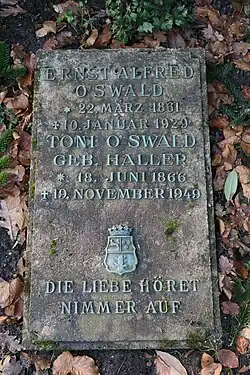 Für Ernst Alfred und Toni O’Swald befindet sich eine Grabplatte in der Familienanlage O’Swald, unmittelbar gegenüber der Grabstätte der Familie Schramm in einer gemeinsamen Nische auf dem Friedhof Ohlsdorf im Planquadrat S 23.