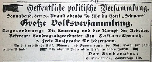 - Carsten Schmidt: Zwischen Burgfrieden und Klassenkampf. Sozialpolitik und Kriegsgesellschaft in Dresden 1914-1918. Diss. phil. TU Dresden 2007, S. 78, 81, 84.