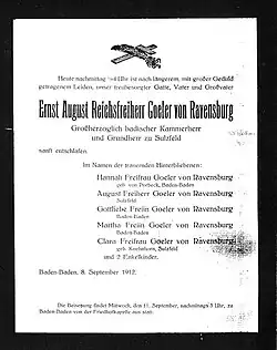 Karl Ernst August Freiherr Goeler von Ravensburg (* 10. April 1837 in Karlsruhe; † 9. September 1912 in Baden-Baden) war Grundherr und Mitglied des Deutschen Reichstags.