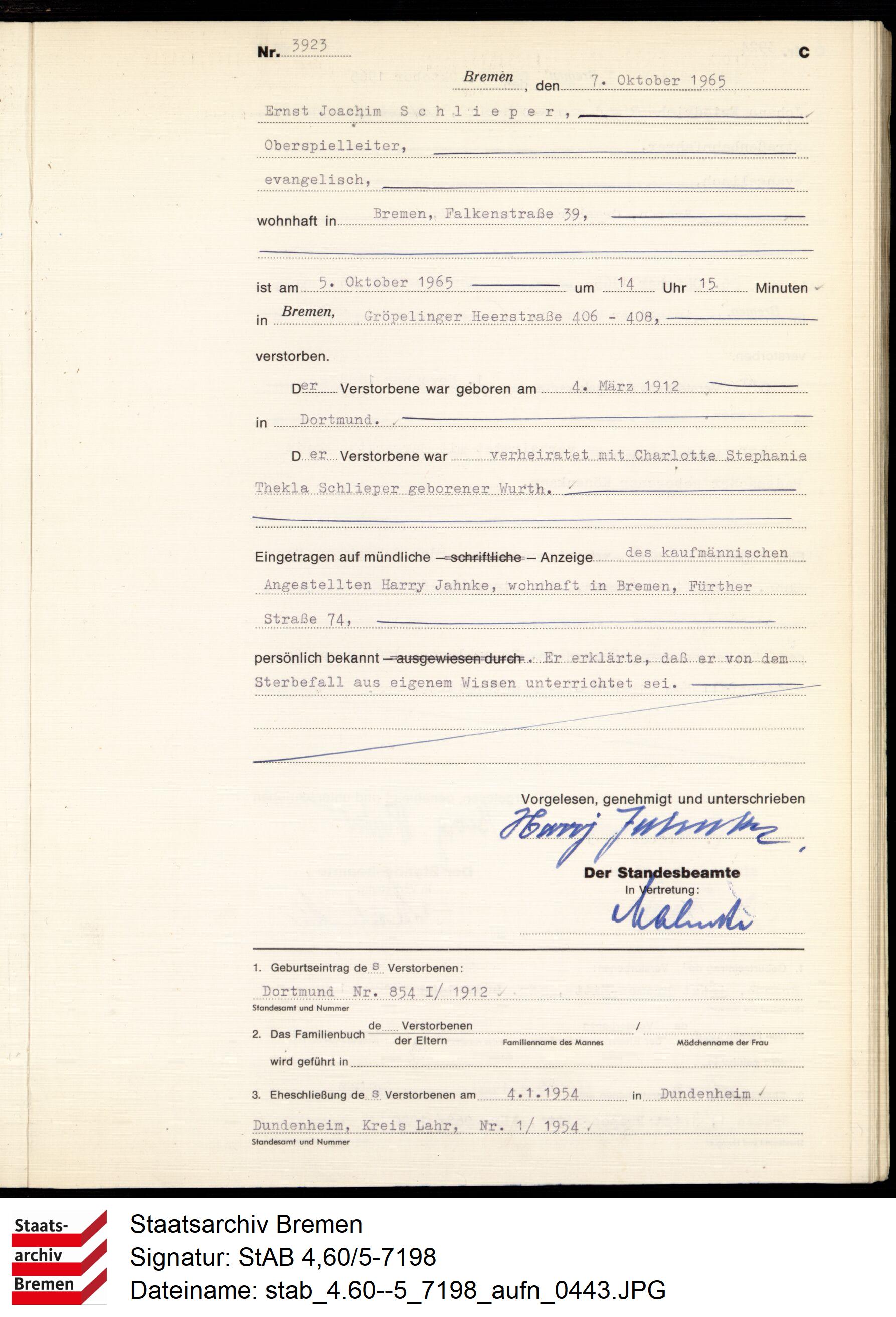 - ↑ Staatsarchiv Bremen, Sterbebuch Standesamt Bremen-Mitte, Nr. 3923/1965 (online beim Archivinformationssystem Niedersachsen und Bremen).