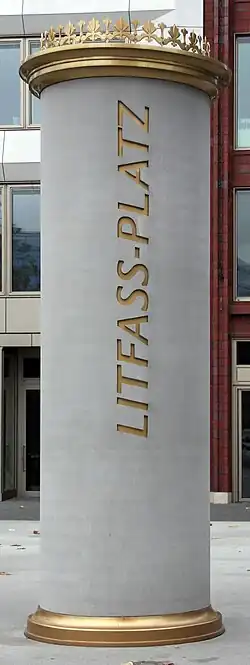Seit Januar 2011 gibt es in Berlin den Litfaß-Platz. Der Platz entstand auf dem neu bebauten Gelände südlich des Bahnhofs Hackescher Markt, dem Hackeschen Quartier.[4] Am Litfaß-Platz 1 hat die Berliner Werbeagentur Scholz & Friends ihren Sitz, die an der Namensgebung des Platzes beteiligt war. In der Mitte des Platzes steht eine 5,25 m[5] hohe Säule, die auf die Namensgebung des Areals hinweist.