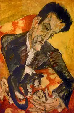 Auch kümmerte er sich um die Wiederherstellung des Kontaktes zu seiner Lebensgefährtin Erna Schilling, die im Atelier in Berlin auf eine Ausreisegenehmigung hatte warten müssen. Sie schrieb über ihren ersten Besuch im Bellevue: „Er hat erstmals in den Ärzten des Hauses und auch in seiner persönlichen Pflege Menschen gefunden, die ihn in jeder Hinsicht fördern und seiner Eigenart entsprechend behandeln.“[16] Freunde, die ihn besuchen, berichteten über eine erstaunlich schnelle Besserung seines Gesundheitszustandes und die Rückkehr seiner Schaffenskraft. Waren die Besucher wieder fort, zeigten sich aber weiterhin schwerwiegende depressive Zustände, die sich auch in einer stark selbstkritischen Haltung zu den gemalten Bildern äußerten: „Mit meinen Bildern habe ich jetzt kein Glück. Sie sehen etwas roh aus. Es ist sehr schwer, aus dem ungeheuren Formen und Farbenreichtum etwas Ganzes zu formen.“[17] Während er seine Gedanken zur Kunst in dieser Zeit immer klarer formulieren konnte, machten ihm die Lähmungserscheinungen in der Händen in der praktischem künstlerischen Arbeit immer wieder zu schaffen. So holte ihn die auf dem Selbstbildnis als Soldat ausgedrückte Befürchtung in abgeschwächter Form als psychogenes Symptom ein.
