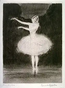 Ab 1909/1910 skizzierte und radierte er viele Darstellungen des populären Russischen Balletts. Seine Eindrücke von den Tanzaufführungen hielt Oppler unmittelbar während der Theaterbesuche fest, wofür er einen speziellen beleuchteten Zeichenstift erfand, der ihm das Skizzieren seiner Eindrücke von der Bewegung im abgedunkelten Zuschauerraum ermöglichte. Auf dem Gebiet der Darstellung von Ballettszenen wurde er der bedeutendste deutsche Chronist des künstlerischen Tanzes. Später rekonstruierte und konkretisierte er seine skizzierten Momenteindrücke von bewegten Figuren in Zeichnungen, Radierungen, Lithographien, Aquarellen und Gemälden. Ausdrucksstark waren die malerischen Tonwerte seiner Radierungen, die er durch flächige Aquatintakörnung und Weichgrundätzungen erzeugte. Diese Technik ermöglichte ihm ein breites Spektrum an Hell-/Dunkelwerten. Ernst Oppler blieb zeitlebens ein distanzierter, leidenschaftlicher Beobachter und kultivierter Ästhet des Balletts, dies brachte ihm den Spitznamen der Tanzmaler ein. Anders als Edgar Degas, der zuvor schon namenlose Ballerinen in der Pause, beim Training, Schnüren der Ballettschuhe und Verbeugen dargestellt hatte und als Ballettmaler galt, eigentlich aber nur ein Genre festhielt, stand bei Oppler die tänzerische Bewegung selbst, das jeweilige Ballettwerk und der individuelle, meist prominente Künstler im Vordergrund (Anna Pawlowa, Tamara Karsavina, Vaslav Nijinsky u. v. a.).[27] Bald wurde Oppler explizit eingeladen, bei den Proben und Aufführungen zu zeichnen, dadurch sind beispielsweise Proben mit Richard Strauss in Paris durch Zeichnungen und Radierungen dokumentiert.[28]