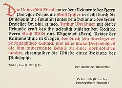 «Die Universität Zürich unter dem Rektorate des Herrn Professor Dr. jur. utr. Ernst Hafter verleiht durch die Philosophische Fakultät unter dem Dekanate des Herrn Professor Dr. phil. et med. Arthur Wreschner mit dieser Urkunde kraft des ihr gesetzlich zustehenden Rechtes Herrn Ernst Wildi aus Wiggiswil (Bern), Rektor der Kantonsschule Trogen, der durch sein überlegenes pädagogisches Geschick und seine starke Persönlichkeit die ihm anvertraute Schule zu einer vorbildlichen machte, ehrenhalber die Würde eines Doktors der Philosophie.»