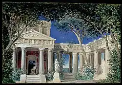 Im Hintergrund eine Seite des an den Venustempel angeschlossenen Portikus, links die Fassade des Pronaos. Die Szene ist draußen. Myrten, Zypressen, Platanen und Oleander grünen vor den Säulen und überall auf der Bühne. In der Mitte befindet sich die Statue der Venus, rechts diejenige des Apollon. Die Tür des Pronaos ist geöffnet, und auf der Schwelle steht ein brennender Altar. Im Hintergrund ist zwischen den Säulen und den Pflanzen ein Streifen ruhigen Meeres und des Horizonts zu sehen. Der Planet Venus leuchtet über dem Meer. Es sind die Aphrodisien, die Feiern zu Ehren der Göttin. Beim Öffnen des Vorhangs sieht man den Chor teils kniend, teils in Verbeugung in Richtung der Tempeltür beten. Auf der Schwelle befinden sich Girlanden, Votivgaben, goldene Kelche, Muscheln und Myrtenzweige; drei Tempeldiener und ein Neokoros stehen an der Tür des Pronaos, um die Weihrauch-Schwaden zu nähren. Licht des Morgengrauens.